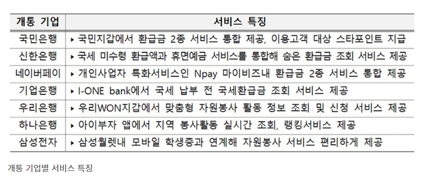 특히 이번 개방을 통해 국세 환급금 조회, 고용·산재보험료 환급 신청, 자원봉사 이력 조회 및 신청 서비스 등