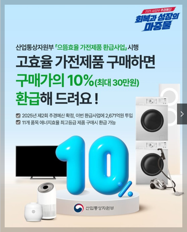 고효율 가전제품을 구매한 가정에 구매가의 10%, 최대 30만 원까지 환급해주는