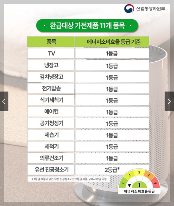 - 환급 대상: 1등급(또는 2등급) 고효율 가전 11개 품목