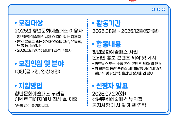 해당 이벤트는 청년 문화예술패스 SNS에서 확인 가능합니다.