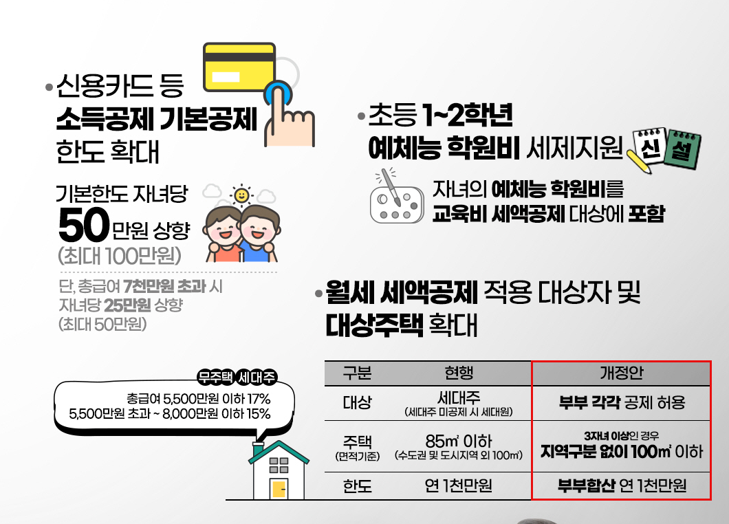 특히 교육비 세액공제 확대, 보육수당 비과세 한도 상향, 신용카드 소득공제 한도 증가 등