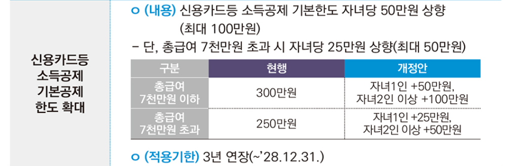 세제 개편안에 따르면 총급여 7,000만 원 이하인 경우 신용카드 소득공제 한도가 자녀 수에 따라 크게 늘어납니다.