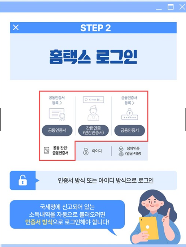 - 홈택스 로그인: 공동인증서 또는 간편인증으로 로그인합니다.