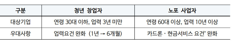 노포 사업자는 제2금융권 카드상품이나 현금서비스 이용 기관 수 제한이 완화되어 지원 문턱이 낮아졌습니다.
